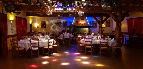 Apéritif, entrée, plat garni, salade/fromage, gâteau, 1/2 vin, café (menu sur devis).